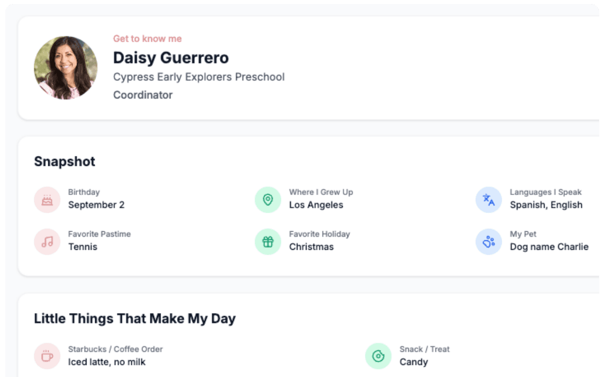 Parents see teacher profiles, no more updating parents on birthdays or chasing teachers for updates.